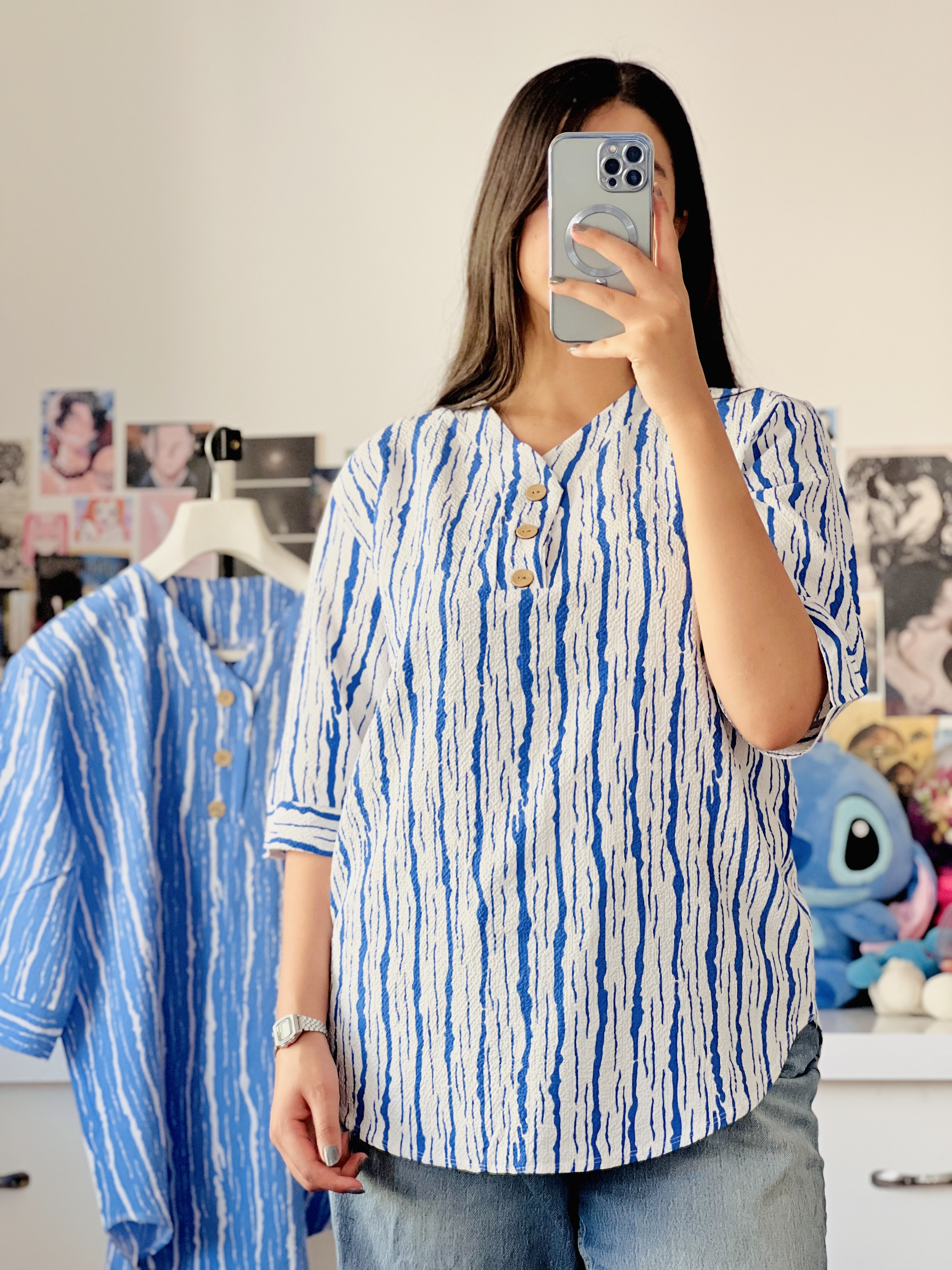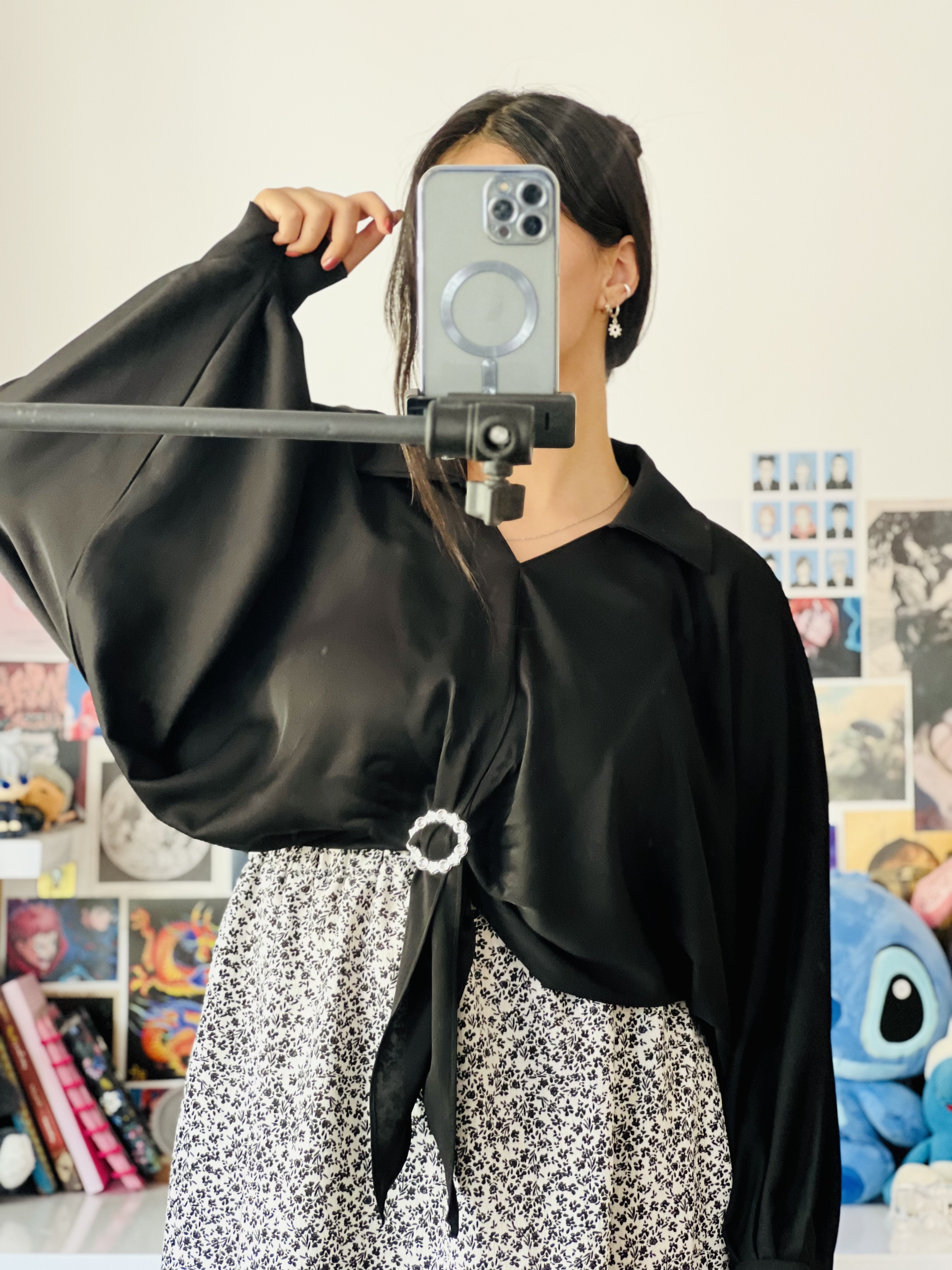 شومیز زنانە بهاره جنس کرپ حریر آستین پاکتی فری سایز